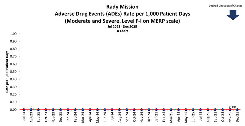 This graph shows the number of Adverse Drug Events per 1,000 patient days. A patient day represents a single day of care provided to a single patient within Rady Mission hospital.