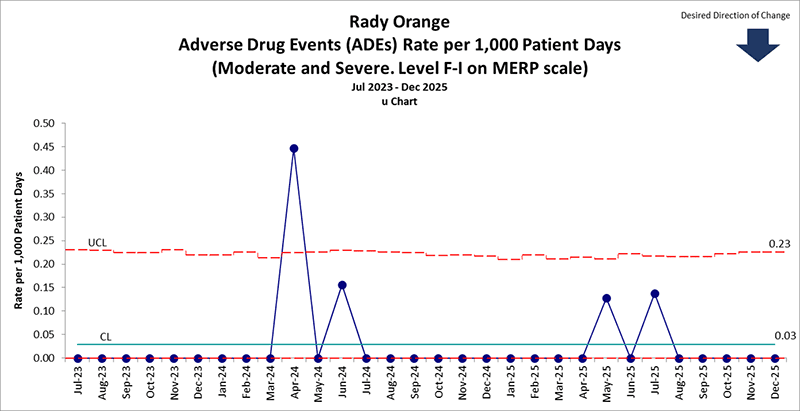 This graph shows the number of Adverse Drug Events per 1,000 patient days. A patient day represents a single day of care provided to a single patient within Rady Orange hospital.