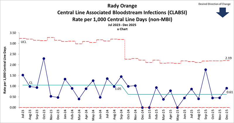 This graph shows the number of central line-associated bloodstream infections (CLABSI) per 1,000 catheter days. Each day the patient has a catheter in place counts as one catheter day.
