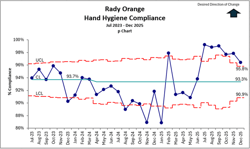 This graph shows the percentage of observed times hand hygiene is properly performed. This includes before and after touching a patient, before and after procedure, after bodily fluid exposure, and after touching a patient’s surroundings.