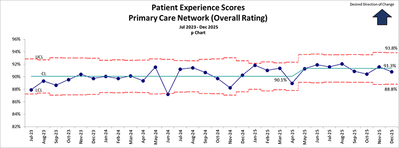 This graph shows the percentage patients and families who score CHOC’s Primary Care Network visits as a score of 9 or 10 out of 10 on patient experience surveys.