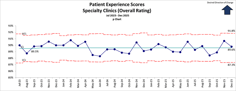 This graph shows the percentage patients and families who score CHOC Orange’s Specialty Clinic visits as a score of 9 or 10 out of 10 on patient experience surveys.