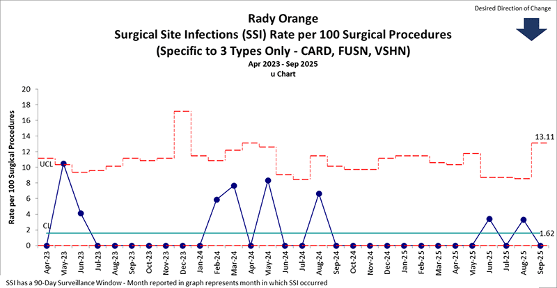 *Surgical Site Infections for cardiac, neurology shunt, and spinal fusion surgeries. This graph shows the number of patients who developed an infection following one of these three surgeries per 100 surgeries.